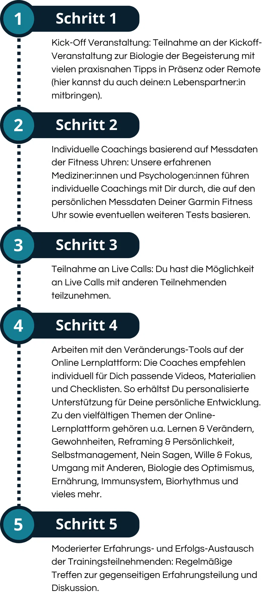 Wir verstehen die Bedeutung von präzisen Daten für nachhaltige Ergebnisse. Daher nutzen wir Garmin Fitness Uhren als persönliche Veränderungsmesser, um Mitarbeitenden präzise Einblicke in die vielfältigen Einflüsse auf ihr Energielevel zu ermöglichen. Die Garmin Uhr hilft den Teilnehmenden unter anderem zu erkennen, wie verschiedene Lebensfaktoren das eigene Energielevel beeinflussen.